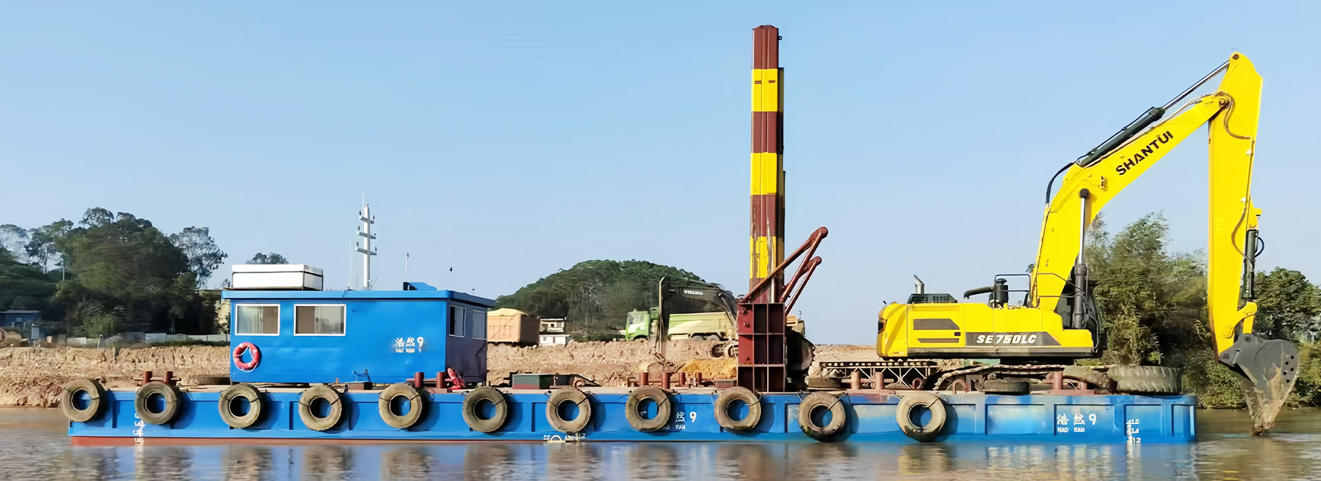 2、施工平臺穩性強,方便挖掘機在深水區施工作業。并且,平臺自帶航行動力,便于水上調遣。